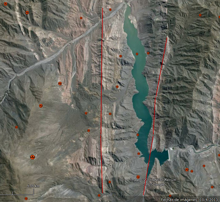 Por otra parte, en las montañas ubicadas en el márgen derecha del perilago se desarrolla una falla geológica a lo largo de la presa.