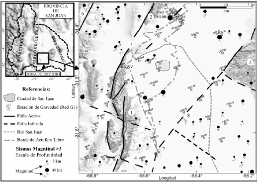 Y cito: "Los sismos corticales ocurridos entre 2008 y 2009 con epicentro en el terreno Cuyania muestran profundidades focales entre 5 y 30 km, magnitudes 3.5 < Mw < 5.3 y mecanismos focales de fallamiento predominantemente inverso. Estos resultados proveen nuevas evidencias del levantamiento del terreno Cuyania y son compatibles con un régimen compresivo actual y de los últimos 10 m.a., determinado por otros autores para la misma zona. Los resultados también son consistentes con una mayor actividad sísmica cortical observada en la provincia de San Juan, la cual podría ser un efecto de la transferencia de esfuerzos desde el borde de placas a más de 500 km hacia el este debido a un efecto de subducción horizontal de la placa de Nazca subducida que contribuye a un mayor acoplamiento a la placa superior. Las características litosféricas y de la corteza continental con mayor densificación en sus niveles más profundos en el sector estudiado, favorecerían también esta transferencia de esfuerzos provocando una actividad sísmica cortical más frecuente e intensa en el terreno Cuyania y sus límites que en aquellos adyacentes."
