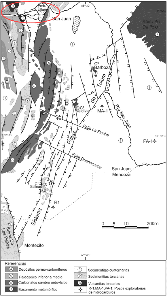 En resumen; la placa de Nazca (que se introduce por debajo del continente en el fondo del Océano Pacífico a pocos kilómetros frente a las costas chilenas) pasa justo por debajo de nuestro territorio entre los paralelos 30° 43' Lat. Sur (Norte de las minas de Hualilán) y 35° 00' Lat. Sur (Sur de General Alvear, Mendoza), a una profundidad promedio de 100 Km.